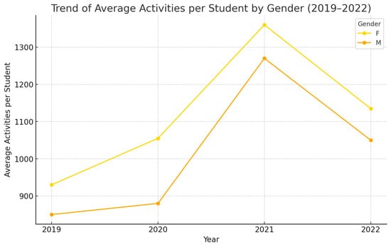When adjusting for the number of students, the activity rate per student is quite close between males and females. Females slightly outperform males in average activities per student in certain years (especially in 2020 and 2022). Overall engagement increased in that period, as students of both genders became more active over time.