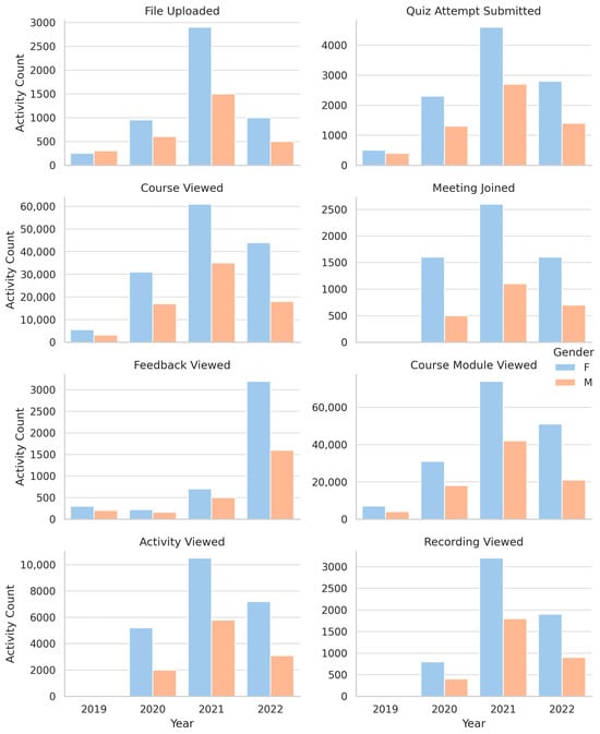 To better understand patterns of student interaction with course materials and learning platforms, an engagement analysis was conducted across gender groups. Engagement metrics provide valuable insights into how students participate in different learning activities, which can influence both academic performance and overall learning experiences. By examining behaviors such as file uploads, quiz submissions, course views, and participation in interactive components like meetings and recordings, this analysis aimed to identify potential gender-based differences in engagement. Understanding these patterns is essential for designing more inclusive and effective learning environments that support diverse learning preferences and promote equitable participation. Figure 6 shows the trend in students’ activities through the years in male and female students.