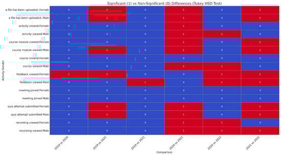 Figure 8 shows the significance of activities based on the Tukey HSD test. The Tukey HSD (Honestly Significant Difference) test was used to explore which specific year-to-year differences in student activity were statistically significant, separated by gender. The results provide nuanced insight into how student engagement changed over time and whether those changes were consistent across genders.