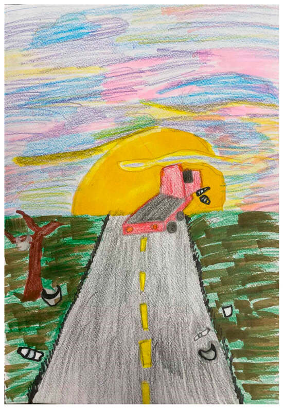 Often, data visual encodings were highly pictorial, blending with artistic or media-arts-based modes of communicating meaning (i.e., visual encoding ). Additionally, sometimes the information encoded was less related to data trends and patterns and more personal perspectives. For instance, Jane, addressing the issue of litter, illustrated a bright, colorful sunset on the top half of her mixed media work and a duller green littered landscape with a truck below (see Figure 3). In this bifurcated composition, color, value, and spatial position served as visual encoding strategies establishing a “pretty” versus “ugly” binary and allowing Jane to comment on life without and with litter, whereas the truck image signified a key finding in Jane’s dataset related to the prevalence of vehicle-based littering.
