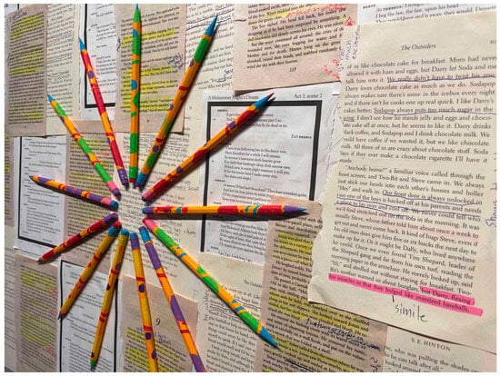 Karen’s In Our Words exemplifies this dominant storytelling strand. In Cycle 1, Karen designed questionnaire items related to 8th graders’ school experiences for a questionnaire administered to local youth. To visualize this data, she painted on the surface of pencils “represent[ing] the emotions we feel” and arranged them in a radial design, which she identified as a “clock” or “sun,” over used “pages [they] read in middle school” (see Figure 4), complete with highlighted text and notes in the margins. In a post-focus group, Karen explicated specific connections to the data set, like “Each pencil represented one person,” and “[I] represented the answers that I got through colors and individual things that I painted on the pencil.” As her questionnaire primarily consisted of multiple-response and open-ended response items, her dataset was sizeable, and the stories she expressed were dense, affective, and multilayered. For instance, she articulated arguments like “a lot of people were tired right now,” their middle-school experiences “were mainly negative,” and “some of them were excited [about high school], but a lot of them were nervous—scared.”