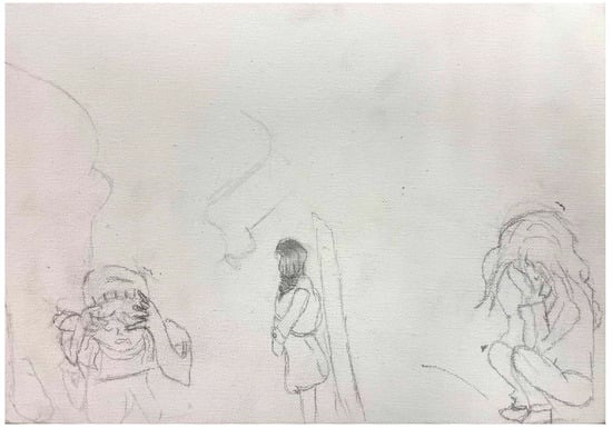 Have You Ever. Note: Anna’s work from Cycle 2. Anna drew multiple figures in emotional poses and included other symbols, like mirrors and partially erased lines, to convey intricate, sometimes metaphorical, narratives about bullying.