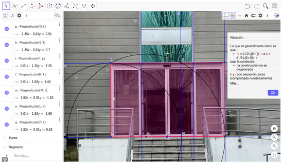 The experience was similar for each of the participating Degrees, taking place in a single 90 min session. The session began with an introduction to GeoGebra Discovery, with special emphasis on the automatic reasoning tool known as Relation and its potential use in Math Trails and MathCityMap. Subsequently, different types of geometric proportionality ratios (such as the golden ratio2, the root of two ratio3 and the silver ratio4) were addressed, illustrating them through practical examples (e.g., paper size according to International Organization for Standardization (2007), historical artwork and monuments, etc.). Thus, students made different constructions according to their level of mathematical knowledge and analyzed them using the specific capabilities of GeoGebra Discovery. After that, the students left the classroom with the objective of identifying and photographing real, rectangular-shaped objects with their cell phones. The task was to select elements that could be linked to possible mathematical activities in the context of a future mathematical walk, perhaps with the concourse of MathCityMap. They were then asked to work with these images in GeoGebra Discovery, formulating conjectures about the proportion between the sides of the chosen objects (the golden ratio, the root of two or the silver ratio), also considering the possibility that none of these might be fulfilled, which opened the door to the discovery of other possible proportionality relationships. To test their hypotheses, the students made geometric constructions directly on the photographs uploaded to the GeoGebra Discovery graphics window and analyzed them using GeoGebra Discovery’s Relation tool, which automatically determines the relationship between the selected segments (see Figure 1).