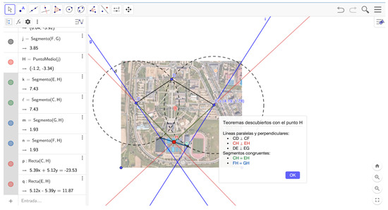 Another example of the singular features of GeoGebra Discovery is displayed in Figure 2, describing the output of the Discover command, which automatically displays all results, subject to some programmed limitations concerning the different tests—collinearity of three points, cocyclicity of four points, equality of segments, perpendicularity of lines, etc.—involving a chosen point such as point H in Figure 2 and the midpoint of F and G, where F and G are obtained from three fixed points D, C, E, so that DC is perpendicular to CF and of equal length, and DE is perpendicular to EG and of equal length. The obtained information allows the user of this command to discover that the position of H does not depend on the initial position of D, only on those of C and E, since the obtained results show that HC and HE have equal lengths and are perpendicular.