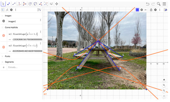 Let us remark that the use of GeoGebra Discovery for outdoor mathematics seeks to expand the possibilities offered by the technology (such as MathCityMap) in Math Trails. Thus, as illustrated in the previous Figures, GeoGebra Discovery could be conceived as a kind of digital tape measure, providing math trail walkers with a reasoning tool that allows them to perceive, on the photos of real objects placed on the GeoGebra Discovery window, a kind of automatically augmented reality that could help them to enhance and support their problem-solving skills in real-life environments, something already suggested in Ariño-Morera et al. (2024) and Botana et al. (2020).