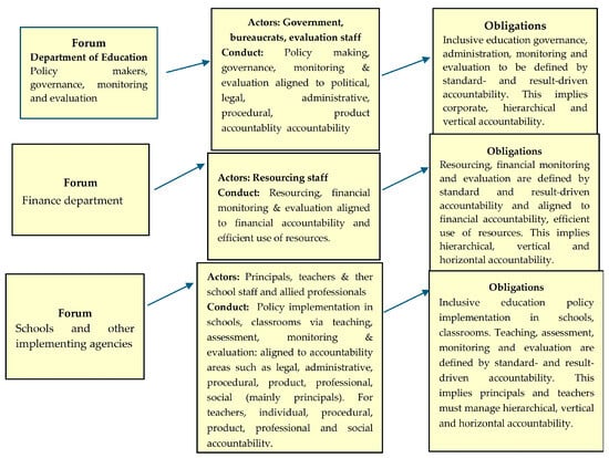 In the proposed model (Figure 1), Bovens’s accountability categories are essential in prescribing roles, responsibilities and obligations for agencies and stakeholders within policy documents, ensuring they are detailed and comprehensive enough to cover the scope and features of inclusive education as envisioned by national governments. At the upper level of Forums, two key state government institutions (the policy-making department, such as the department of education, and the finance department) are indispensable to accountability. The actors in the education department, as policy makers, and finance department, as the pedestal for resource allocation, have specific accountability obligations relating to governance and resourcing, which should be prescribed in the IE policy. These prescriptions should encompass the legal dimensions, including human rights, governance stipulations, resourcing and principles of standard-driven and result-driven accountability (Anderson, 2005; McLaughlin & Rhim, 2007).