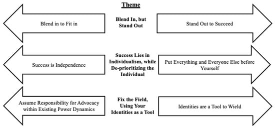 This theme spoke to an implied responsibility for students with minoritized identities to make their field more inclusive, while wielding their identities as a tool. Codes included expectations of action (e.g., teach the class/faculty about your identities, advocate for yourself, be happy to be a token representative) and resisting action (e.g., don’t argue back, don’t assimilate). The codes and definitions within this theme are presented in Table 4 below.