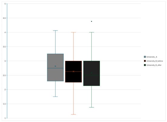 According to the procedure described above, at University A, the “monolingualism–multilingualism index” exhibited a mean of M = 2.91 (SD 0.96), and at University B, (before the lecture) the mean was M = 2.63 (SD 0.54). After the lecture at University B, the mean was M = 2.58 (SD 0.66). The lower the index (on a scale 1–5), the greater the multilingual beliefs. The results are visualized in Figure 1.