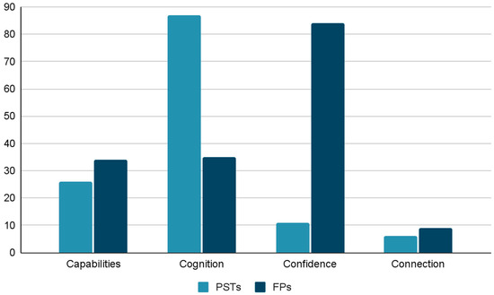 In addition to their cognition, PSTs were also somewhat likely to demonstrate capabilities with six PSTs combining to make 24 total coded comments (21% of the PST comments). Most of the capabilities codes reflected the PSTs’ work to build rapport, including positive statements about students, such as “He’s coming in, smile on his face, and he’s really ready to go…I know in the past, he’s been a little hesitant to jump into the lesson, but he’s really been engaged and outgoing”, and proactive family engagement and familiar with school procedures like the PST who said, “If email isn’t the easiest way to contact, because I know that you’re probably busy with your own life…[I can] reach out either through [the school’s communications app] or I could give you my cell phone number”. One of the most extended displays of capability came from a PST engaged in a conversation about whether a student should be placed on an advanced track for math. The PST demonstrated a facility with school systems when he explained that “about 50% of our students take Algebra 2A and 2B in the two-year sections”, and showed flexibility in accommodating FPs when he agreed to put the student on the faster track, saying, “I think she’ll have a much better grasp and understanding of the content knowledge if she does this”. Rather than leave it there, the PST confirmed the plan with the FP and then summarized as follows: