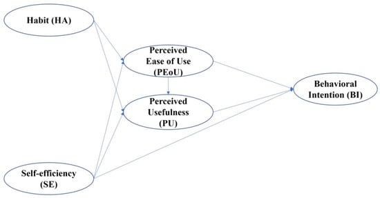 This study extends the Technology Acceptance Model (TAM) by incorporating two external variables, habit and self-efficacy, to investigate students’ acceptance of Map-OLS. Building on previous theoretical and empirical research, the proposed model aims to examine the relationships among perceived usefulness (PU), perceived ease of use (PEoU), self-efficacy (SE), habit (HA), and behavioural intention (BI) in the context of map-based online learning systems. The research model proposed in this study is shown in Figure 1.