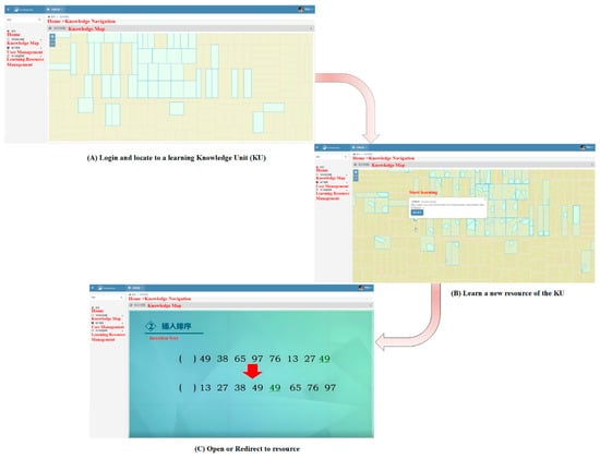 Actual learning process. (A) The last screenshot of the prior study after logging in. (B) Select one resource of the knowledge unit by clicking one polygon of the map to study. (C) Open the resource.