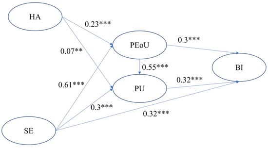 The hypothesized relationships described in our initial model (see Figure 1) were tested collectively using structural equation modelling (SEM) via Mplus. The SEM test results are shown in Figure 4 and Table 9. As shown in Figure 4, eight hypotheses were tested and confirmed. The specific hypothesis testing results are presented in Table 9, including β coefficients, t-values, and whether the hypotheses hold. The results indicated the significant acceptance of all the factors with respect to behavioural intention to use Map-OLS. Specifically, habit directly influences PEoU and PU (H1: β = 0.23, p < 0.001; H1a: β = 0.07, p < 0.01). Self-efficacy positively influences PEoU, PU, and behavioural intention to use Map-OLS (H2: β = 0.61, p < 0.001; H2a: β = 0.30, p < 0.001; H2b: β = 0.32, p < 0.001). Furthermore, PEoU significantly affects PU and behavioural intention to use Map-OLS (H3: β = 0.55, p < 0.001; H3a: β = 0.30, p < 0.001). PU has a significant positive influence on behavioural intention to use Map-OLS (H4: β = 0.32, p < 0.001).