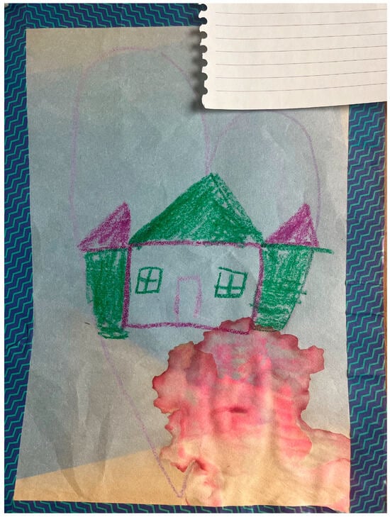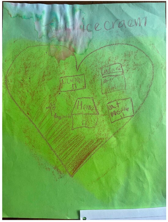 Immediately, a wave of colorful construction paper fanned across the room, accompanied by a plastic bucket of worn, broken crayons. The kids settled into their seats, the earlier buzz softening into the quiet hum of crayons against paper. Aniyah and Aliyah, still brimming with excitement from their talk with Donny, furiously crafted their heart maps, their hands flying as they began to sketch their worlds (please see Figure 3 and Figure 4).