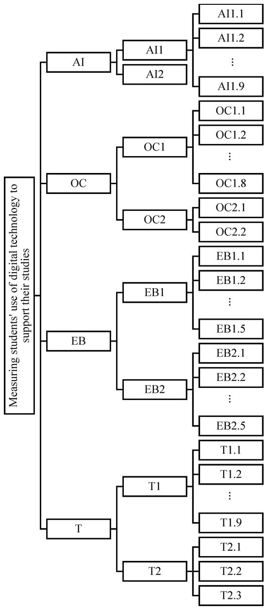 The scheme of the criteria hierarchy for measuring students’ use of digital technology in their studies is shown in Figure 1, with descriptions of the meaning of symbols in Table 5.