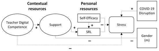 Figure 1 depicts the a priori hypothesized relations that guided both the CFA and the subsequent SEM analyses. The solid arrows represent hypothesized direct effects; the dashed arrow indicates an indirect path (teacher digital competence → stress via support). The plus and minus signs denote expected positive and negative associations, respectively.