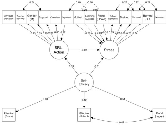 In addition, four single-item predicators/covariates were recorded: (a) perceived support, (b) teacher digital competence, (c) COVID-19 learning disruption, and (d) gender (male = 1, female = 0). Of these, perceived support enters the SEM as a predictor of stress and SRL—action.