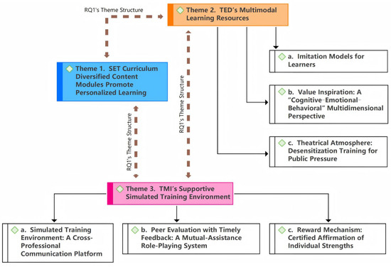 Codes were clustered into overarching themes through inductive analysis, yielding constructs such as: “Diverse SET modules facilitate personalized learning,” “TED’s theatrical atmosphere desensitizes public speaking anxiety,” and “TMI’s reward system certifies individual strengths.” These themes captured both the SET’s instructional design and its psychological effects on language potential.
