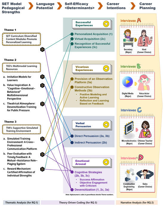 A theoretical model, i.e., the “SET Pedagogy → Self-Efficacy Enhancement → Career Development”, was built by linking the SET features (e.g., TMI’s constructive feedback) to self-efficacy determinants (verbal persuasion) and the self-efficacy outcomes (e.g., increased confidence in sales pitches) to career choices (Interviewee D’s transition to sales). This cross-case comparison revealed how SET systematically strengthens self-efficacy to bridge language skills and career competencies.