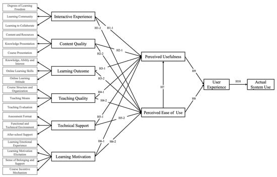 This study is grounded in the TAM, but introduces an innovative modification by replacing its traditional “Attitude Toward Use” (ATU) and “Behavioral Intention” (BI) constructs with “User Experience” (UE). Recent studies have demonstrated that UE not only significantly influences initial technology acceptance, but also plays a critical role in enhancing long-term satisfaction and continuance intentions (). While the classic TAM emphasizes PEOU and PU, the broader integrative construct of UE more comprehensively captures learners’ overall responses—encompassing affective reactions, cognitive appraisals, and behavioral feedback—when engaging with online instructional resources, thereby offering superior predictive power for sustained system usage ().