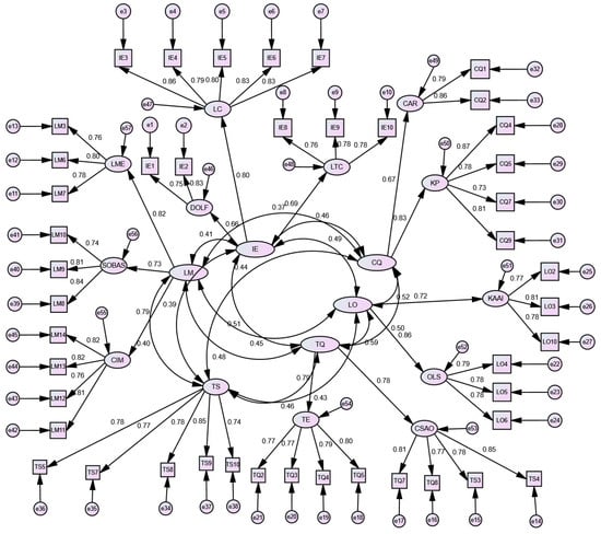 Reliability analysis of the pre-test scale showed that Cronbach’s α for each dimension exceeded 0.70, indicating acceptable reliability. Item analysis, however, revealed that deleting certain items would further improve the α value. Accordingly, items IE11, CQ3, CQ6, CQ8, LO1, LO7, LO8, LO9, LO11, TQ1, TQ6, TQ9, TS1, TS2, TS6, LM1, LM2, LM4, and LM5 were removed, yielding a final overall Cronbach’s α of 0.908 (Table 3).