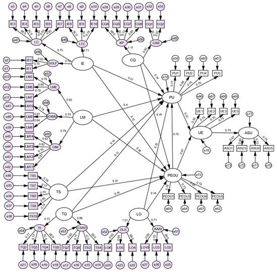 In summary, an online teaching system that combines operational simplicity, efficient resource access, an intuitive interface, and human-centric features can deliver a more seamless learning experience. Through the reduction of cognitive barriers, high PEOU enables learners to focus their cognitive resources on the content itself, thereby enhancing overall LO ().