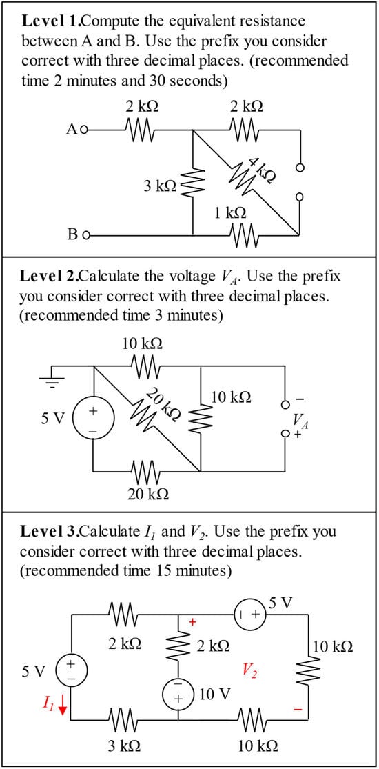 A sample of the exercises from the homework corresponding to the second week is shown in Figure 1. It displays points from the three different levels. At this stage, the students have only seen the definitions of the electrical variables (voltage, current, and power), as well as Kirchhoff’s voltage and current laws, Ohm’s law, and the series and parallel interconnection and equivalence for resistors. Even in these basic topics, students have difficulties in appropriating and using DC circuit concepts (Leniz et al., 2014; Li & Singh, 2012).