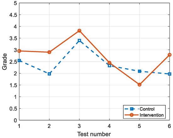 Figure 3 illustrates the differences in the results of the first six quizzes administered to the students during the study. Except for the fifth quiz, the intervention group performed better, obtaining an average grade of 2.8, compared with the 2.4 obtained by the control group. This result implies that the presence of instructions in the different homework tasks improves the learning process or performance in the quizzes.