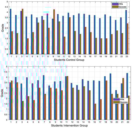 Figure 4 shows a comparison of the GPA and the average grade achieved in the quizzes for each of the students in the control group (top) and intervention group (bottom).
