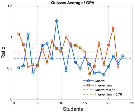 The ratio between the quiz grades and the GPA of the students was 0.65 for the control group and 0.76 for the intervention group, indicating that the average grades in this course are lower than the GPA for most students, as shown in Figure 5. Nevertheless, an advantage was observed for the intervention group, with only one student achieving a ratio below 0.5.