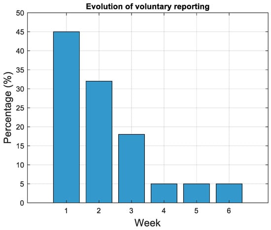 The students in the intervention group could voluntarily record the time it took to solve each exercise in a worksheet. Nevertheless, it is not possible to infer from this tool the number of students that used the homework exercises to prepare for the evaluation. Figure 6 shows the evolution of the worksheet completion, with the number of students who completed these worksheets remaining consistently below 50% and this number decreasing as the semester advanced, ending with only one student completing the report (5%). Even if the students in this group orally indicated that they used the homework for preparation, since completing the worksheet was not mandatory, they did not report it. For this reason, it is essential to promote the use of this tool in upcoming semesters.