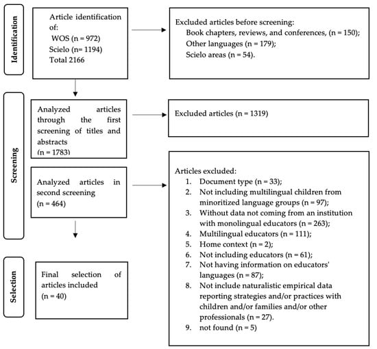 This literature review included articles that met the following criteria: (a) studies published between 1990 and 2024; to incorporate studies not previously systematized; (b) written in English or Spanish, (c) included bilingual or multilingual children; simultaneous or sequential between the ages of 0–6 who speak minoritized languages (e.g., immigrants, Indigenous populations), (d) collected data from early childhood education institutions with monolingual educators; articles were reviewed thoroughly to confirm this—if not explicitly stated, they were excluded after agreement with a second author, (e) reported empirical data about educators’ strategies and/or practices involving children, families, or other professionals in naturalistic settings. Excluded articles focused on children or students from other educational levels and those centered on home practices.