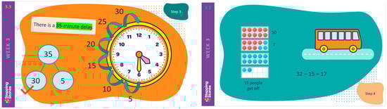 Framed within the context of a visual metaphor—stepping stones across a river—the programme prompted teachers and pupils to focus attention on the learning process and to understand and implement metacognitive approaches in mathematics teaching. Programme materials were developed by two members of our research team and included teacher scripts and pupil-facing session slides. Programme sessions were structured around worked examples—complete part-by-part demonstrations of a particular approach ()—to encourage pupils to critique approaches to mathematical problem solving whilst reducing demands upon cognitive load (; ; ). Session slides were used to review possible approaches to mathematical problems step by step, representing each step on an individual session slide. The number of steps varied between 3 and 10, depending on the complexity of the mathematical problems. Each step was annotated, drawing upon the work of (), who suggest that both labelling and segmentation increase the likelihood that pupils will adapt methods rather than persist with previous approaches. Examples of session slides are provided in Figure 1.