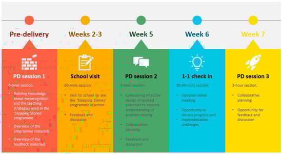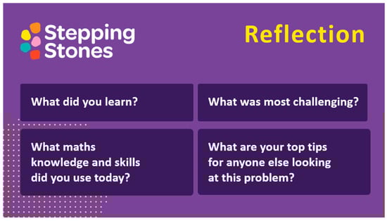 Combining the findings from research into metacognition and teacher PD, we developed a programme and accompanying PD offer to enhance teachers’ understanding and use of metacognitive strategies to develop mathematical problem solving. This programme drew upon earlier work from one member of our research team, employing metacognitive strategies with 9–11-year-old pupils (; ). The refined programme—"Stepping Stones”—was piloted with 6–7-year-old pupils in five primary schools in England (6 × Year 2 classes and 1 × mixed Year 1/2 class) across ten weeks between January and March 2024, drawing upon the findings of (), who found larger effects for metacognitive interventions delivered in ten or more sessions. Intended to supplement the daily mathematics lesson, sessions lasted between 15 and 20 min in duration and were delivered as a whole-class intervention, three times per week.