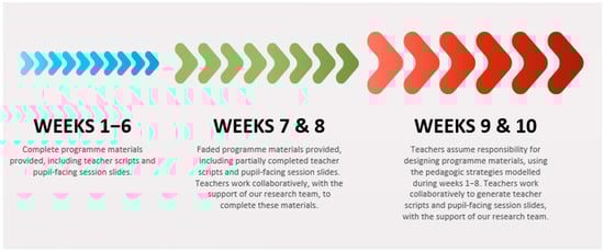 A central principle of Stepping Stones was the fading approach it adopted. For the initial six weeks of the programme, all session plans and resources were provided for teachers by our research team. This was intended to support teachers’ internalisation of metacognitive teaching strategies, helping these to become embedded within teachers’ instructional repertoires. In the final four weeks of delivery, the scaffolding offered by programme materials gradually faded, with the provision of partially completed session slides and teacher scripts during weeks 7 and 8 of delivery and blank materials during weeks 9 and 10. This fading process prompted teachers to assume increasing responsibility for session planning, and is represented below, in Figure 4. Although faded worked examples are well-established in the literature regarding skills acquisition as a means of managing learners’ cognitive load (; ), to our knowledge, this is their first application in a teacher PD context. At the outset of this study, our working hypothesis was that the fading design would prompt the gradual transition from the heavily scaffolded use of metacognitive strategies towards teachers’ more independent application as they planned and created their own programme materials in the final four weeks of delivery.