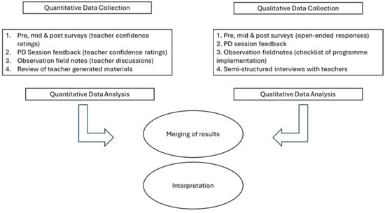 Following data collection, analysis was conducted separately, drawing upon quantitative and qualitative analytical techniques (see Section 2.5 and Section 2.6). The independently analysed quantitative results and qualitative themes were then systematically merged, allowing for cross-validation, corroboration, and explanation of the findings. An example of this is the quantitative data collected from the pre-, mid-, and post-programme surveys; following analysis, these were integrated with qualitative PD session feedback and semi-structured interview findings to add depth and detail in our reporting.