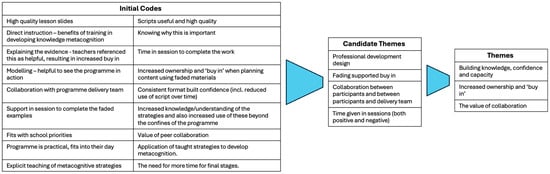 By internalising the structures and key ideas utilised within weeks 1–6 of the Stepping Stones programme, participating teachers appeared to become less dependent on the scaffolds as the programme progressed. Qualitative responses shared during post-programme interviews indicated that, during later weeks of delivery, increased confidence enabled teachers to move beyond the use of the session scripts to deploy metacognitive strategies with greater flexibility, including devising appropriate metacognitive questions in response to classroom interactions with pupils. This shift was further reinforced during the collaborative planning sessions, in which participants’ suggestions deepened their understanding of how and when to deploy metacognitive strategies effectively.