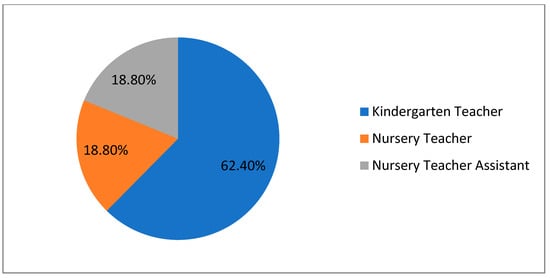 Regarding the educational level of the participants and their occupation, Figure 2 and Figure 3 provide the information. Most teachers appeared to hold a basic degree, at 53.1%, followed by those with a postgraduate degree at 29.7%, while most participants were kindergarten teachers, at 62.4%, followed by nursery teachers and nursery teacher assistants, each at 18.8%.