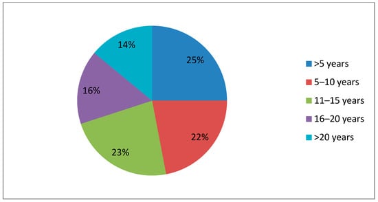Concerning the institution in which they are employed, most participants work in public nursery schools, at 59.4%, followed by employees in private kindergartens, at 17.2%, and 15.6% in public kindergartens, and only 7.8% in private nursery schools. Regarding their years of experience, Figure 4 presents the participants’ work experience, revealing that most participants claimed to have worked for up to 5 years, at 25%, followed by those with 11–15 years of experience at 23%.