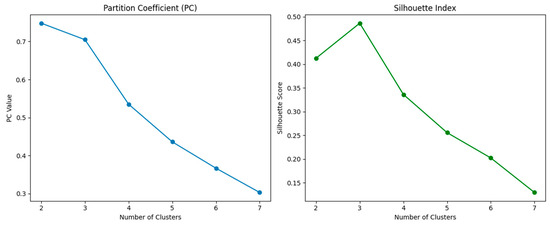 - Fuzzy Clustering and User Segmentation: Fuzzy C-Means (FCM) was employed to identify latent user profiles based on the weighted maturity scores. The optimal number of clusters was determined using Partition Coefficient (PC) and Silhouette Index metrics. The resulting clusters revealed diverse patterns of AI usage and reflection, from over-reliant users to critically engaged users.