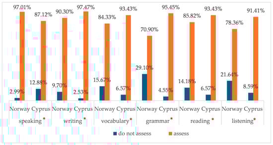 A similar divergence appears in the assessment of vocabulary and grammar, where Cypriot teachers seem to place a stronger emphasis on discrete language components. The findings highlight differences in vocabulary and grammar assessment between Cypriot and Norwegian teachers, with 93.4% and 95.5% of Cypriot teachers assessing these areas, compared to 84.3% and 70.9% of teachers from Norway (for vocabulary: χ2(1) = 10.273, p = 0.001; for grammar: χ2(1) = 62.916, p < 0.0005). Cypriot teachers seem to emphasize explicit assessment, reflecting a test-driven approach that prioritizes grammatical accuracy (Tsagari & Giannikas, 2021). However, Norwegian educators embed grammar and vocabulary within communicative tasks rather than isolating them following local curricula mandates (Utdanningsdirektoratet, n.d.). This contrast illustrates Cyprus’ structured, exam-oriented model versus Norway’s process-based pedagogy that fosters natural language development (Caspersen & Smeby, 2023; Hansen et al., 2023; Looney et al., 2008).