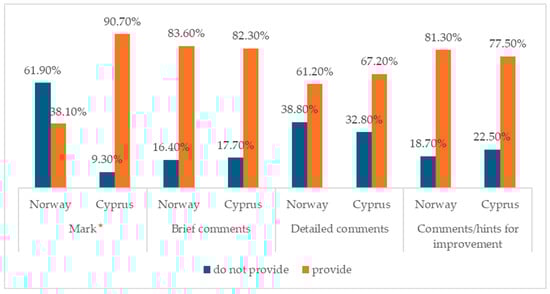 The role of brief comments as feedback shows no significant difference between the two educational contexts, χ2(1) = 0.111, p = 0.739, yet some disparities exist. Specifically, compared to male teachers in Norway (100.0%), male teachers in Cyprus reported that they provide such feedback at lower rates (57.7%), χ2(1) = 11.599, p = 0.001. Also, compared to teachers in Norway with students of 16–18 years of age (50.0%), their Cypriot counterparts reported that they provide such feedback at higher rates (83.5%), χ2(1) = 7.363, p = 0.007. M. Borg (2001) suggests that teacher beliefs shape assessment practices, and Cypriot educators may view brief comments as insufficient for meaningful feedback. In contrast, Norwegian teachers embed such comments within formative assessment strategies that provide scaffolding and actionable guidance (Bøhn & Tsagari, 2021; Looney et al., 2008). This reflects Norway’s structured approach to feedback, aligning with principles of culturally responsive assessment (Gay, 2018).