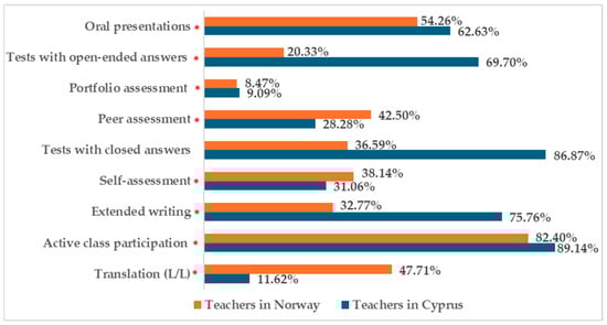 The comparative analysis of assessment practices between Cypriot and Norwegian teachers provides significant insights into how different educational cultures prioritize various assessment methods (see Figure 3).