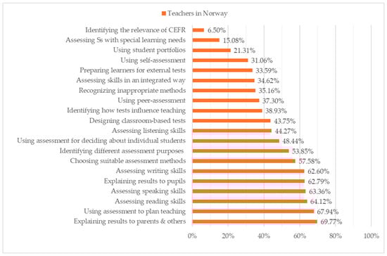 Reported confidence in aspects of language assessment for teachers in Norway (for ease of comparison, this graph reports only the two highest levels of confidence (‘confident’ and ‘very confident’).