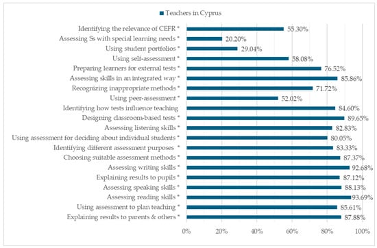 Reported confidence in aspects of language assessment for teachers in Cyprus (for ease of comparison, this graph reports only the two highest levels of confidence (‘confident’ and ‘very confident’). Asterisks indicate significant differences between the two countries. Note: asterisks show significant differences between countries at α = 0.05.