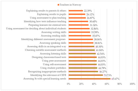 Integrated skills assessment was an area where Norwegian teachers expressed significantly lower confidence (35%) and a greater interest in training (40%) than Cypriot teachers (86% confidence, 15% training interest): for confidence, U = 11,044.000, p < 0.0005; for training interest, χ2(1) = 39.530, p < 0.0005. Norway’s adherence to CEFR-driven holistic language assessment accounts for this trend (Council of Europe, 2001), while Cyprus’ preference for skill-specific testing (Tsagari, 2016) discourages demand for integrated assessment approaches.