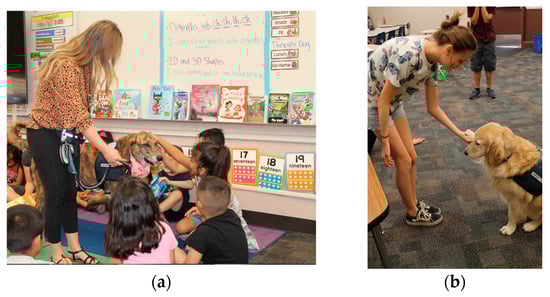 Two figures of therapy dog interventions in the Paws and Peers program in classrooms: (a) elementary age students are shown sitting and petting a therapy dog with her handler that are visiting their classroom; (b) a junior high school student is shown bending down and shaking a paw with a therapy dog.