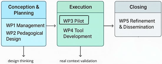 The Learning Design for Flexible Education (FLeD) project directly addresses the European Commission’s call (2022–2025 KA220-HED) for innovation in digitally supported teaching and learning. Running from December 2022 to May 2025, the project brings together six leading European institutions: Università Degli Studi di Trento, Universidade Aberta, Universitetet I Stavanger, Sofia University St Kliment Ohridski, Universidad Pompeu Fabra, and Universitat Autònoma de Barcelona. The project targets a significant gap in pedagogical effectiveness in digital learning contexts. It is organized into three phases and five work packages (WPs) (cf. Figure 1) and was conceived following a design thinking approach (Brown, 2009), with a strong focus on collaborative design and user-centered innovation. While not based on a design-based research (DBR) methodology (Anderson & Shattuck, 2012), but in a mixed-methods approach, some iterative cycles were integrated in the pilot implementation (WP3)—the focus of this article—to ensure responsiveness to real-world contexts.