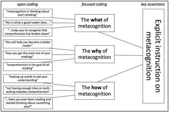Second-round coding, focused coding (Saldaña, 2016), was used to categorize our codes into frequent instructional moves or content matter. Categories developed following corroboration included items such as “the what of metacognition,” “thinking aloud,” and “guiding questions or prompts.” Third-round coding involved establishing key assertions (Erickson, 1986) by matching focused codes with stages of GRR and triangulating across data sources (see Figure 2 for a representation of collapsing codes). We also held member checks with Elizabeth and Nance to validate or question our assumptions and understandings (Merriam & Tisdell, 2016).