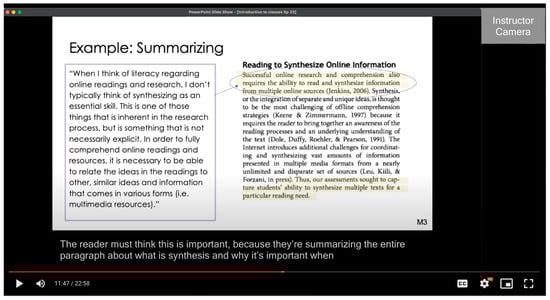 Elizabeth and Nance collaboratively developed slideshow presentations that would support their instruction. The first presentation was titled, “Perusall for Social Annotation and Community Engagement,” and it defined social annotation, some of its benefits, and community engagement. Here Nance also introduced questioning and criticality, and Elizabeth did not. In this learning context, we refer to criticality as analyzing and evaluating the meaning of texts through a lens of equity, power, and privilege (Adams et al., 2022). The second was titled, “Getting the Most Out of Your Course Readings,” and it defined reading comprehension, comprehension strategies, metacognition, with emphasis on monitoring and summarizing. The third was titled, “Getting the Most Out of Your Monitoring: Using Strategies to Better Comprehend.” It defined connecting, inference, and synthesizing. Elizabeth created a fourth presentation, “Using Your Metacognition to be Critically Literate,” in which she recalled metacognition, and introduced questioning and criticality, as Nance did in her first slideshow. They planned to present the slideshow presentations within a GRR framework. Notably, the slideshows’ topics also built on one another and were increasingly complex in terms of comprehension strategy use, which aligns with historical conceptions of GRR (Pearson et al., 2019). The presentations contained largely the same content, but varied slightly regarding when and in what order content was presented to learners. The instructors recorded videos of themselves talking through the presentation slides. Each video included explicit instruction, modeling, and guided practice. The videos were embedded in the courses and assigned to students in each course to complete as part of the course requirements.