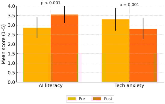 As shown in Table 1, AI literacy increased 0.9 SD (t = 6.10, p < 0.001, d = 0.91), while technology anxiety decreased 0.6 SD (t = −3.82, p = 0.001, d = 0.56). Both instruments showed high internal consistency (α > 0.88), and normality assumptions were met (Shapiro–Wilk, p > 0.10).